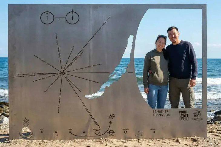 Работу создали по мотивам «Пластины Пионера» — послания для внеземных цивилизаций. Ее автор — художник Золто Цыбикжапов.