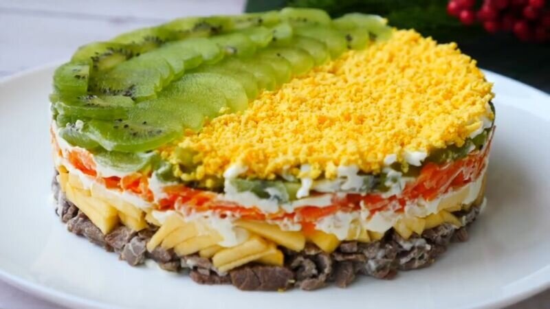 7. Завершающий штрих: оставшимся желтком покройте одну половину салата, используя мелкую тёрку, а на вторую половину выложите киви, нарезанный полукольцами. Оберните салат пленкой и оставьте в холодильнике для настаивания.