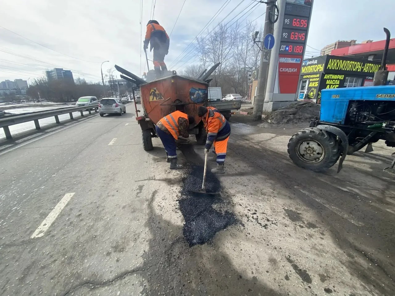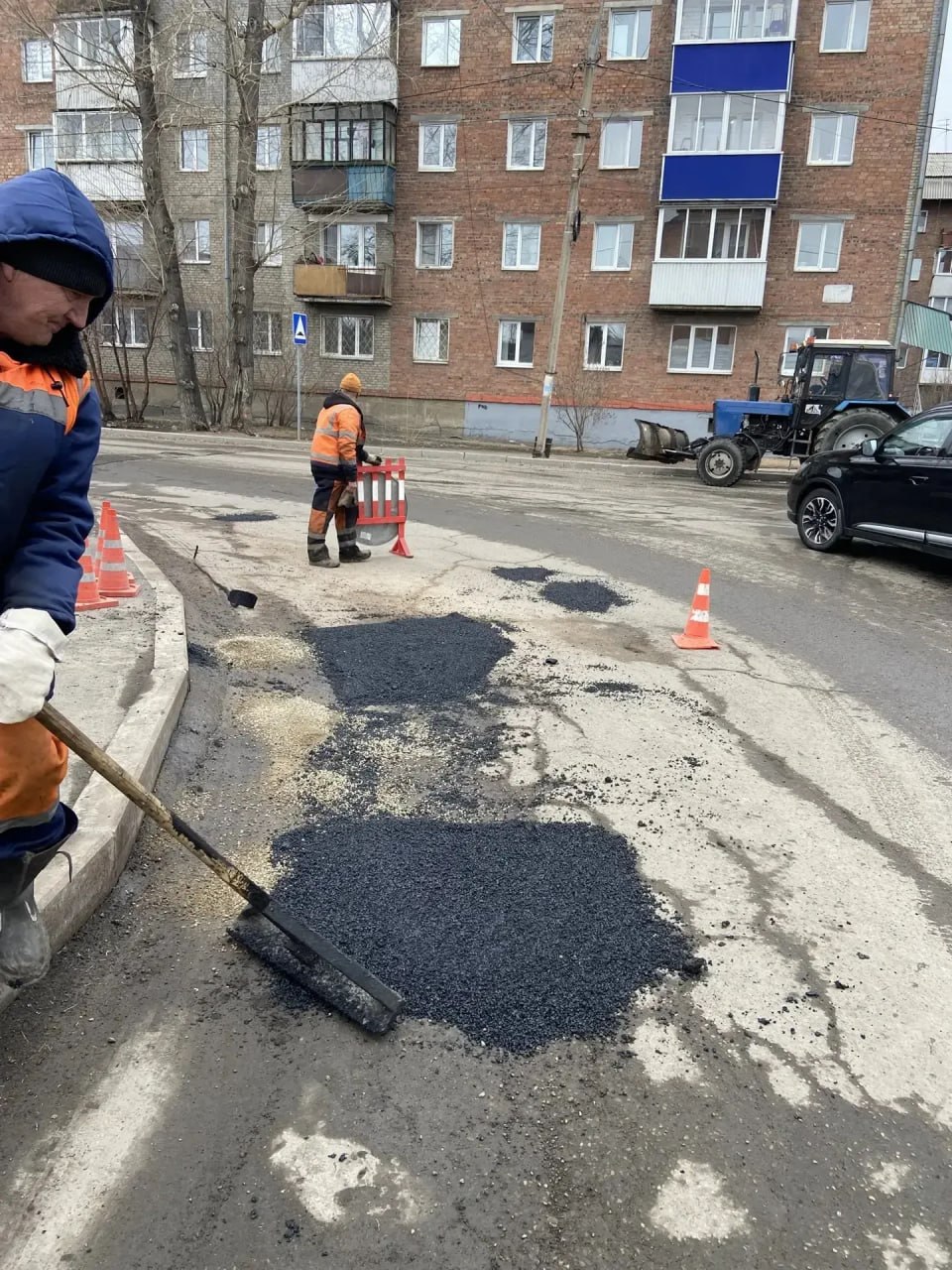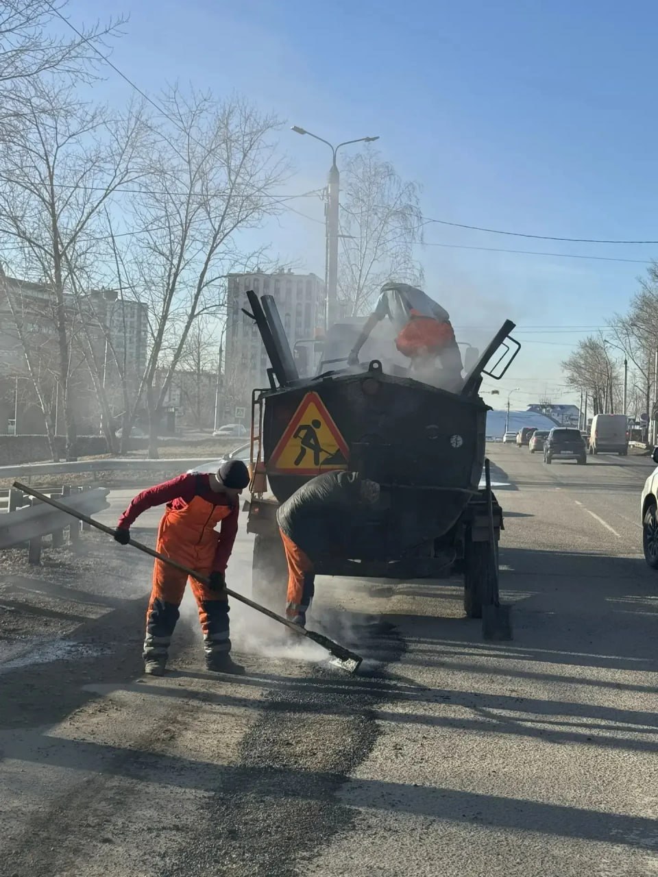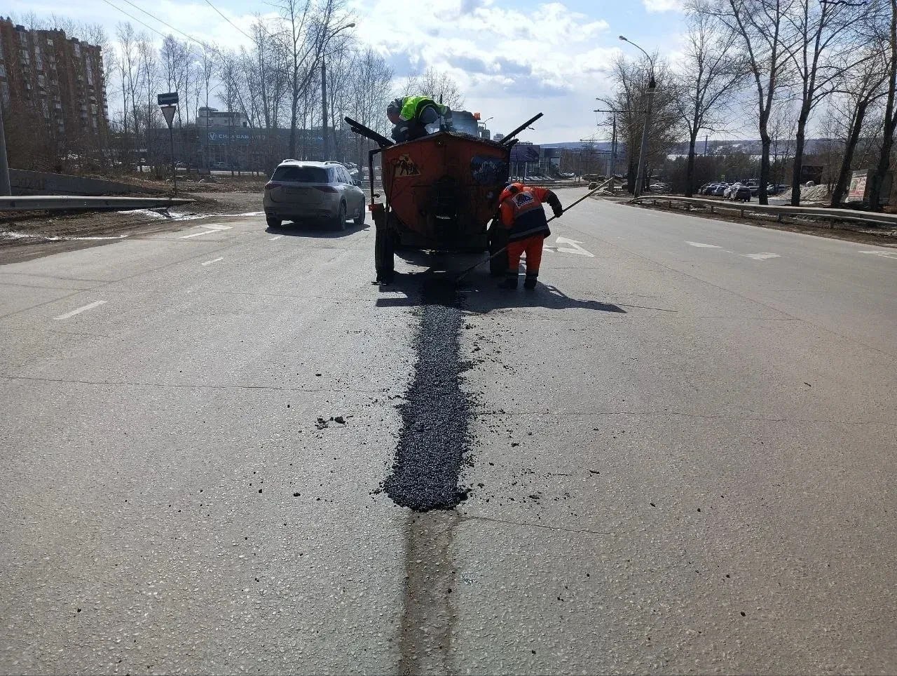 Дорожное покрытие в Иркутске восстанавливают литым асфальтом.