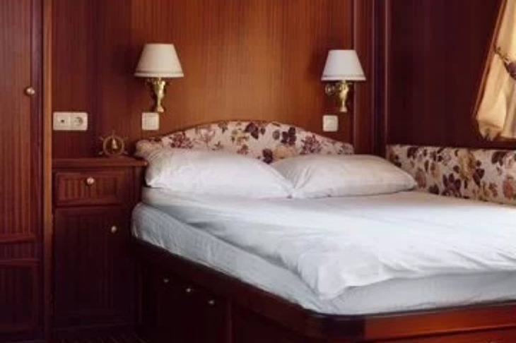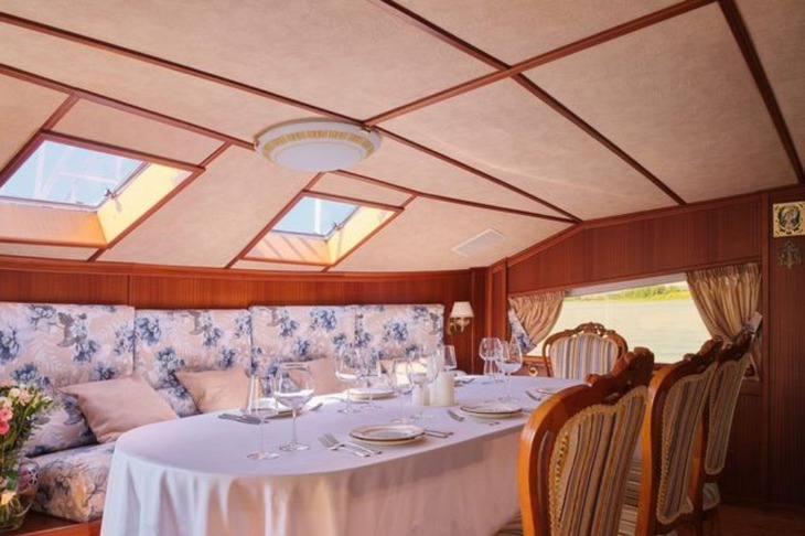 Теплоход длиной почти 30 метров и шириной более пяти метров рассчитан на комфортное размещение группы до 14 человек — на борту обустроены шесть кают. Для пассажиров есть открытая палуба с обеденной зоной под навесом, а также сауна.