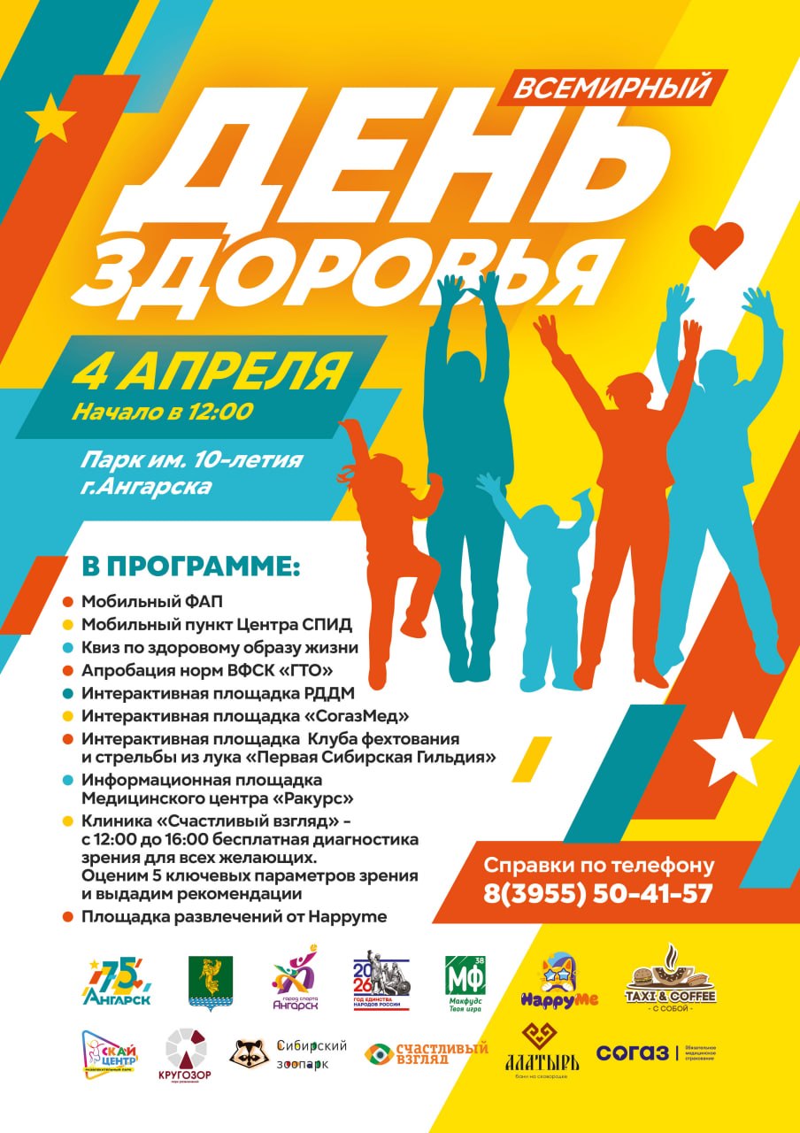 Активных и спортивных жителей Ангарского округа приглашают присоединиться к празднованию Всемирного дня здоровья. Всех ждут 4 апреля в парке имени 10-летия Ангарска. Торжественное открытие запланировано на 12.00.