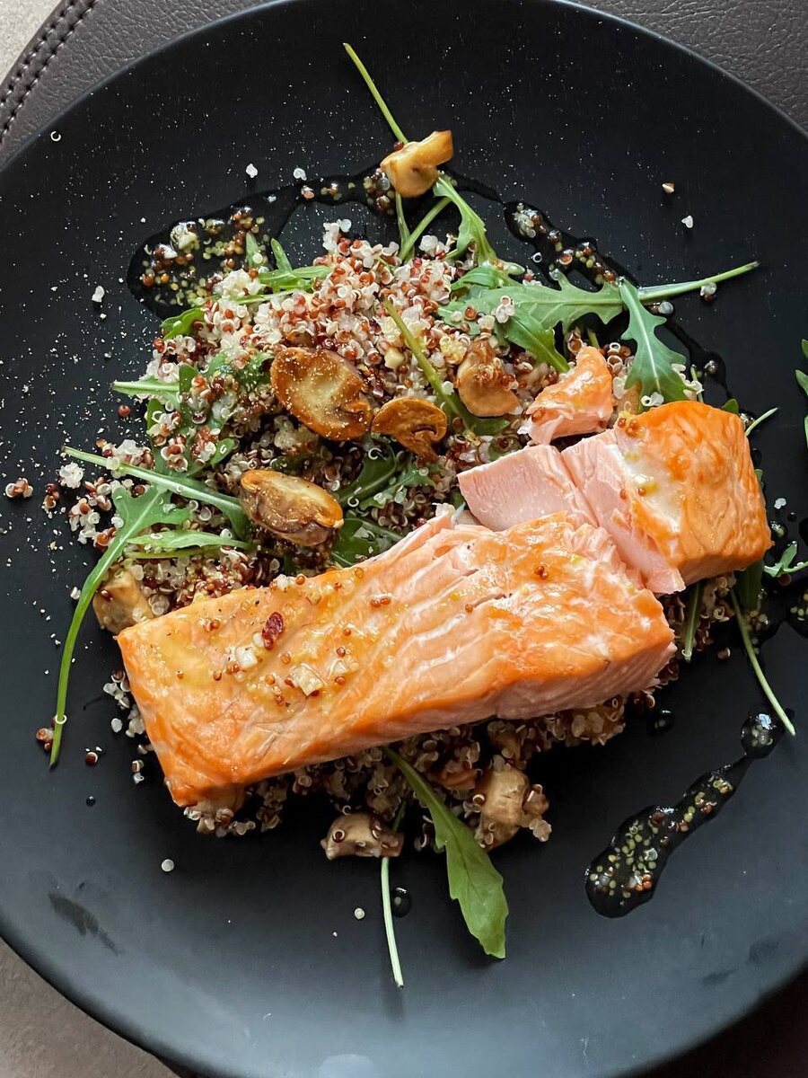Перед подачей смешайте рукколу с киноа и грибами. Разложите все по тарелкам, полейте заправкой и сверху выложите отточенный лосось. Этот легкий и полезный салат обещает приятный вкус и станет прекрасным дополнением к каждому столу.