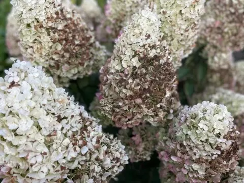 - Пересушка почвы: Гортензии с поверхностной корневой системой требуют регулярного полива, и даже один пропуск может привести к усыханию соцветий.