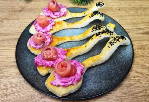 Эта закуска станет настоящей звездой любого стола! Миниатюрные хрустящие ложечки с яркой свекольной начинкой и изящными розочками из красной рыбы привлекают внимание и радуют глаз.
