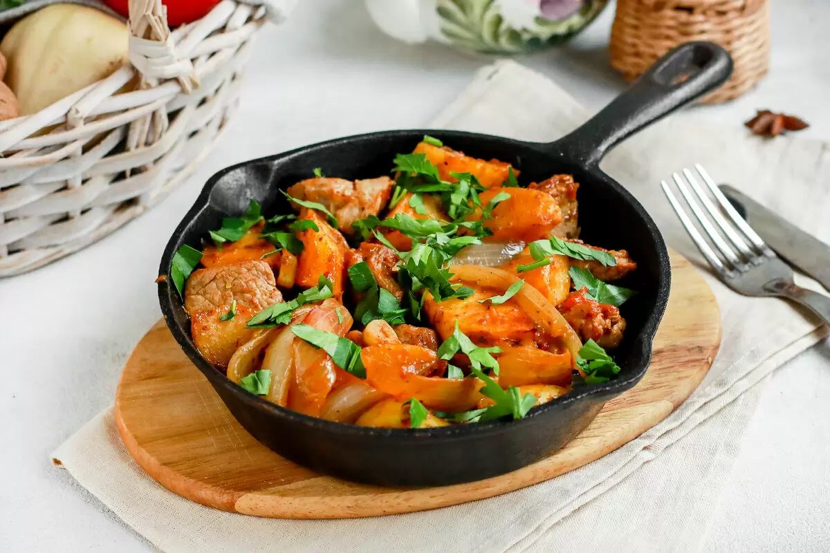 Обжарка мяса: Пока картофель запекается, нарежьте лук полукольцами, а чеснок — тонкими кольцами. В глубокой сковороде разогрейте растительное масло и обжарьте свинину на сильном огне около 3-4 минут. Убавьте огонь до среднего и добавьте лук, продолжая жарить еще 2-3 минуты.