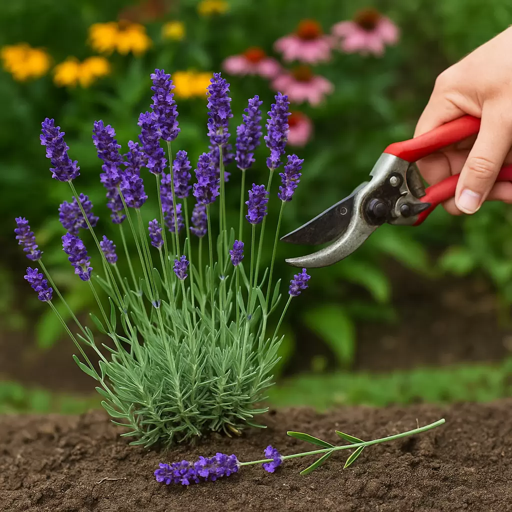 - Лаванда. Обрезка на 5-7 см ниже отцветших цветоносов позволит ей зацвести в сентябре.