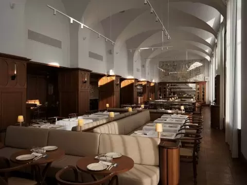 Интерьер выдержан в классической манере: сводчатые потолки высотой около семи метров, дубовые настенные панели и панорамные окна. Открытая кухня позволяет наблюдать за процессом приготовления. Барная карта включает авторские коктейли, среди которых «Укроп Блинова», «Сибирская звезда» и «Яблоневый сад» — напитки подчеркивают общую идею сочетания локальных ингредиентов и современной подачи.