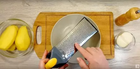 Начинать приготовление стоит с картофеля. 700 граммов овоща натереть на мелкой терке. Удобнее всего это делать прямо в дуршлаге, чтобы лишняя жидкость могла стекать.