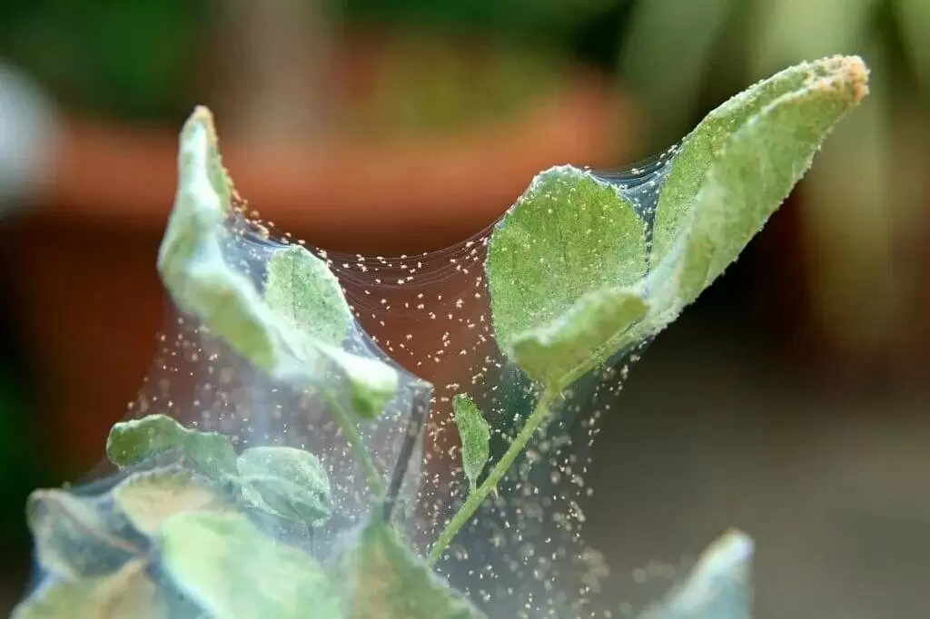 - Паутинный клещ. Этот крошечный паразит таится на листьях, оставляя за собой паутину и желтоватые пятна. Чаще всего клещ появляется в условиях сухого воздуха и высоких температур.