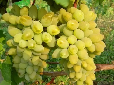 Ягоды имеют привлекательную сосковидную или овальную форму, весом 6-8 граммов, и при полном созревании их белая окраска приобретает янтарный оттенок. Мякоть плотная и хрустящая, что вместе с тонкой кожицей создает интересную текстуру. Сахар в ягодах накапливается до 170-220 г/дм?, а кислотность держится на уровне 6-9 г/дм?, обеспечивая сбалансированный вкус с выраженными мускатными нотами.