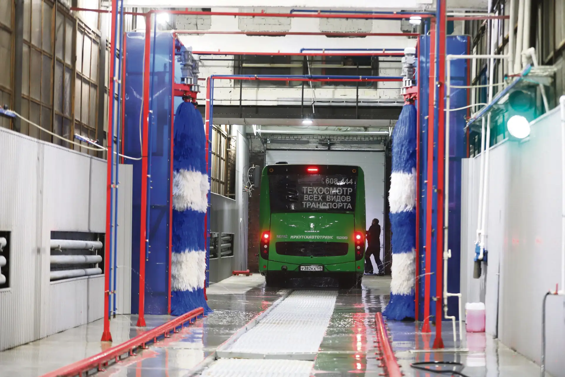 Ежедневно с шести утра на городские маршруты выходят более ста муниципальных автобусов. Благодаря новому моечному комплексу технологический процесс очистки теперь занимает около трех минут. По словам Александра Носова, заместителя директора «Иркутскавтотранса» по техническим вопросам, процедура выглядит так: фотодатчики реагируют на приближение автобуса, система самостоятельно включает четыре цикла: подача воды под напором, нанесение пены, затем следует работа щеток и финишный обмыв.