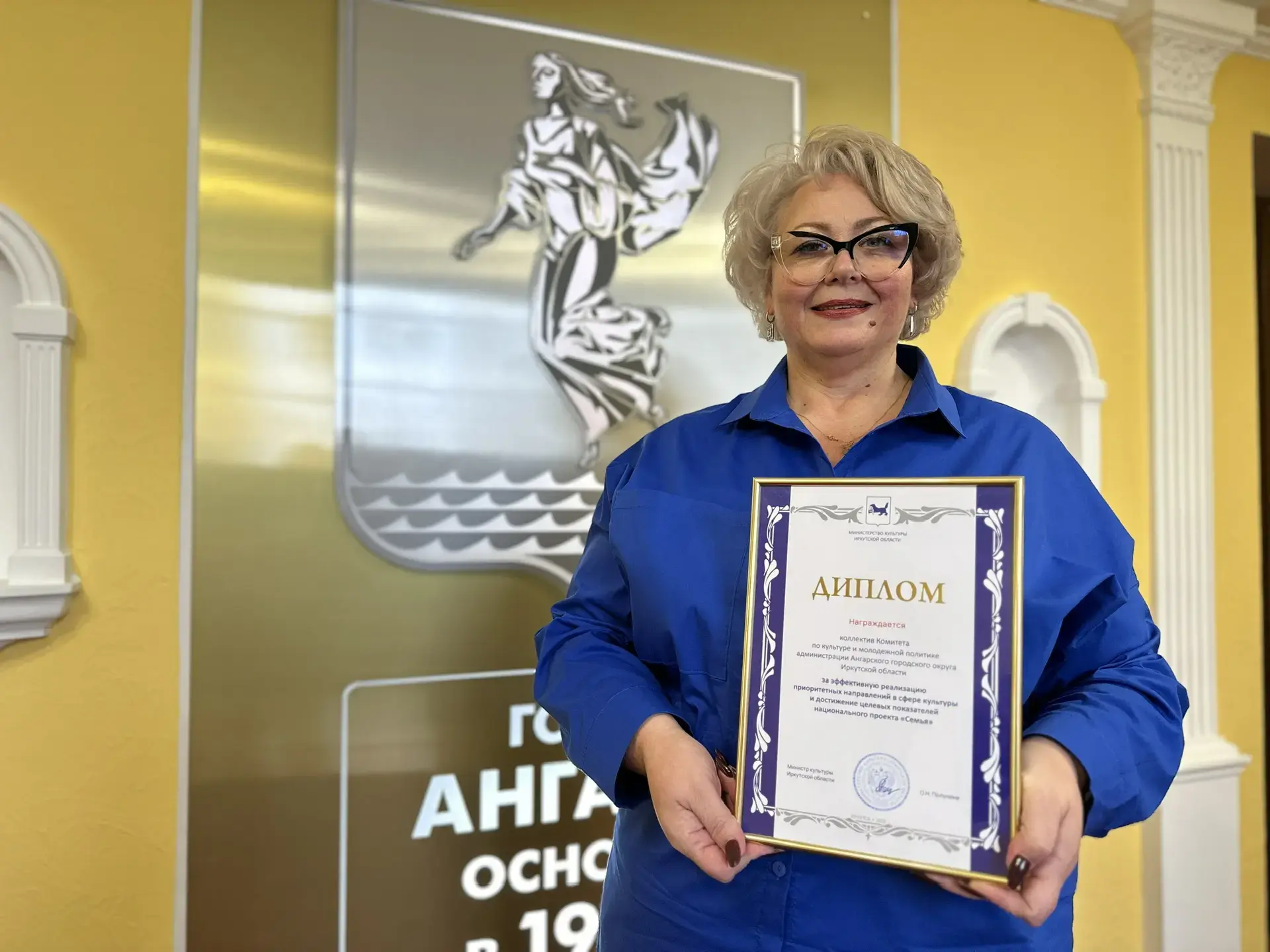 Коллектив Комитета по культуре и молодежной политике администрации Ангарского городского округа награжден дипломом за эффективную реализацию приоритетных направлений в сфере культуры и достижение целевых показателей нацпроекта «Семья». Документ подписан министром культуры Олесей Полуниной.