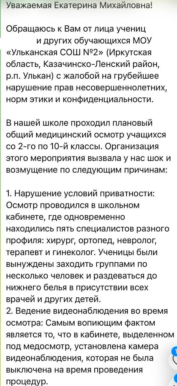 Ко мне обратились ученицы из Ульканской СОШ 2 (Иркутская область). По словам девочек, на днях в школе проходил медицинский осмотр. От его проведения многие пребывают в полном шоке.