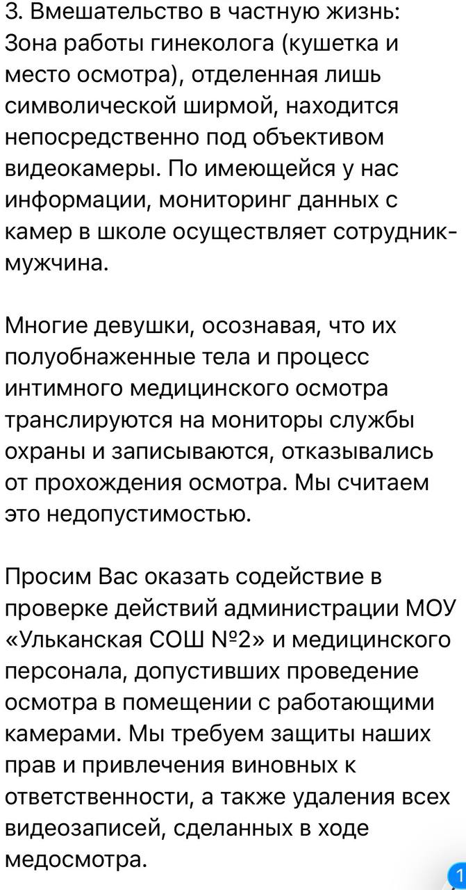 Так, мне пишут, что осмотр в одном кабинете вели несколько специалистов, включая гинеколога. Туда одновременно заходили группы школьниц и их просили раздеваться. По словам девочек, в кабинете установлена камера наблюдения, которая не была выключена на момент проведения осмотра. Многие, зная об осмотре и наличии в кабинете камеры, просто отказывались от его прохождения. Другие обеспокоены, что процесс осмотра и записи с камер попали в руки мужчины, который мониторит камеры в школе.