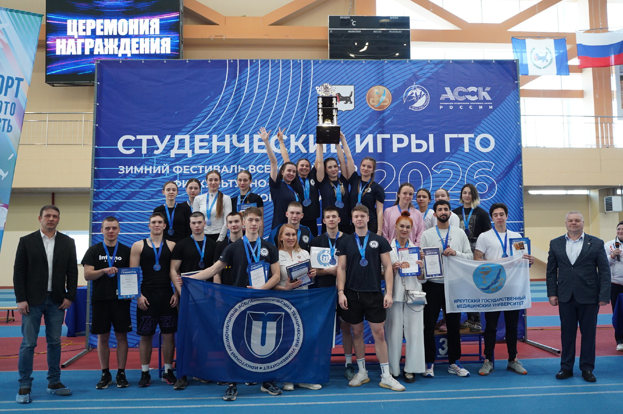 Команда Иркутского национального исследовательского технического университета заняла первое место в общекомандном зачете на Зимнем фестивале Всероссийского физкультурно-спортивного комплекса «Готов к труду и обороне» (ГТО) «Студенческие игры ГТО 2026». Соревнования проходили 17 марта в спорткомплексе «Байкал-Арена» и в бассейне Государственного училища олимпийского резерва в Иркутске.