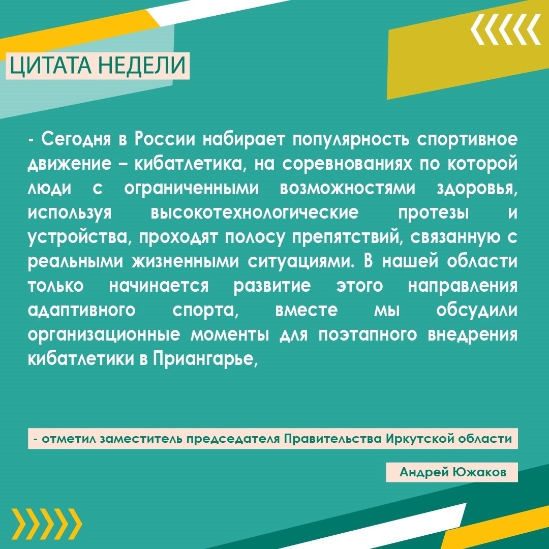 На этой неделе заместитель председателя Правительства Приангарья Андрей Южаков, министр спорта области Виктор Учеватов и заместитель руководителя филиала фонда «Защитники Отечества» по Иркутской области Мария Разуваева посетили Центр протезирования «Байкал-Орто», где обсуждались вопросы развития кибатлетики и проведения соревнований.